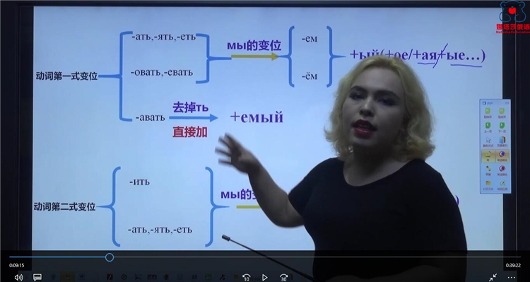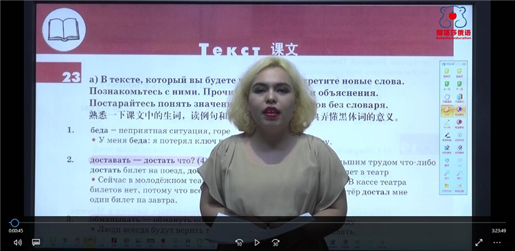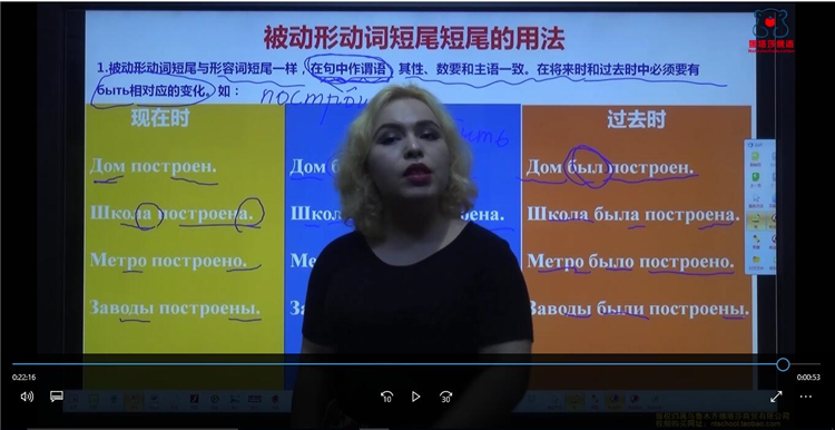 课程目录 走遍俄罗斯3全书一共有6 节大课,分为54课时讲完。(其中有3节预习课)[娜塔莎俄语视频教程走遍俄罗斯3]主要语法内容为:主动形动词,被动形动词,被动形动词短尾,带ся动词的意义,形容词比较级,最高级;副词的比较级;运动动词前缀意义等走遍俄罗斯3一共讲解120小时左右,内容非常详细!下面是走遍俄罗斯3视频课程中的一些截图,主讲老师是娜塔莎