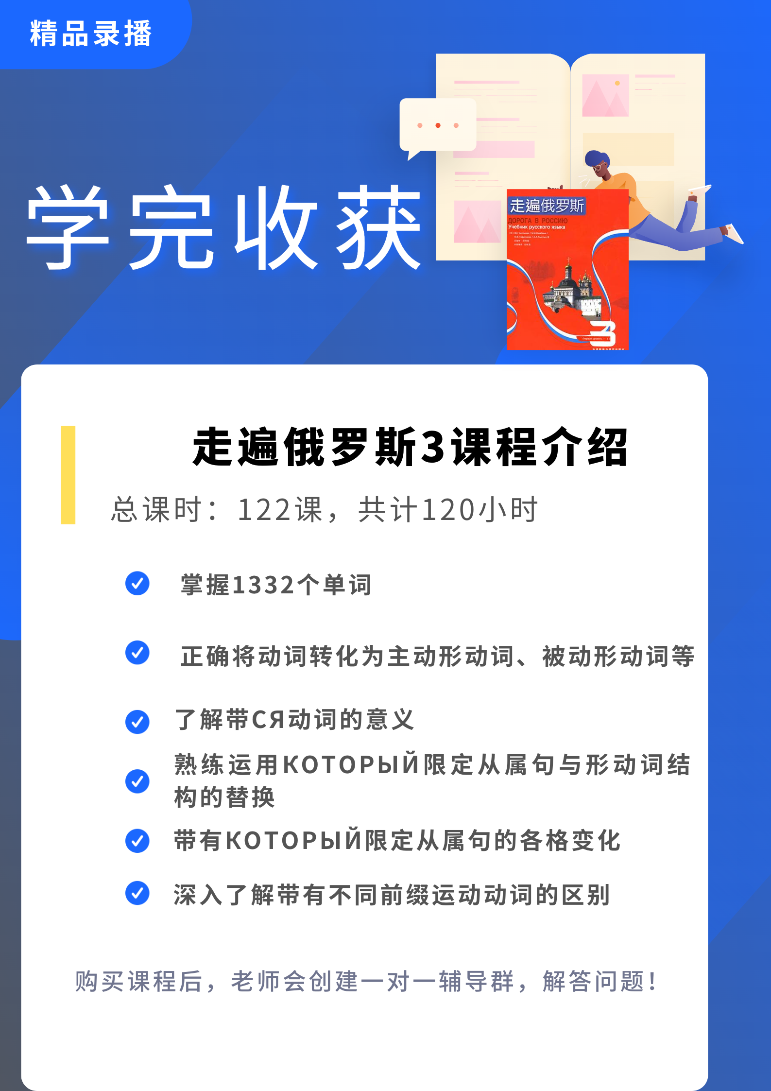 娜塔莎俄语走遍俄罗斯3,走遍俄罗斯第三册录播课程分为122课时讲解,总时长120小时。推荐俄语A2以上水平学习,走遍俄罗斯在莫斯科国立大学的预科中经常使用