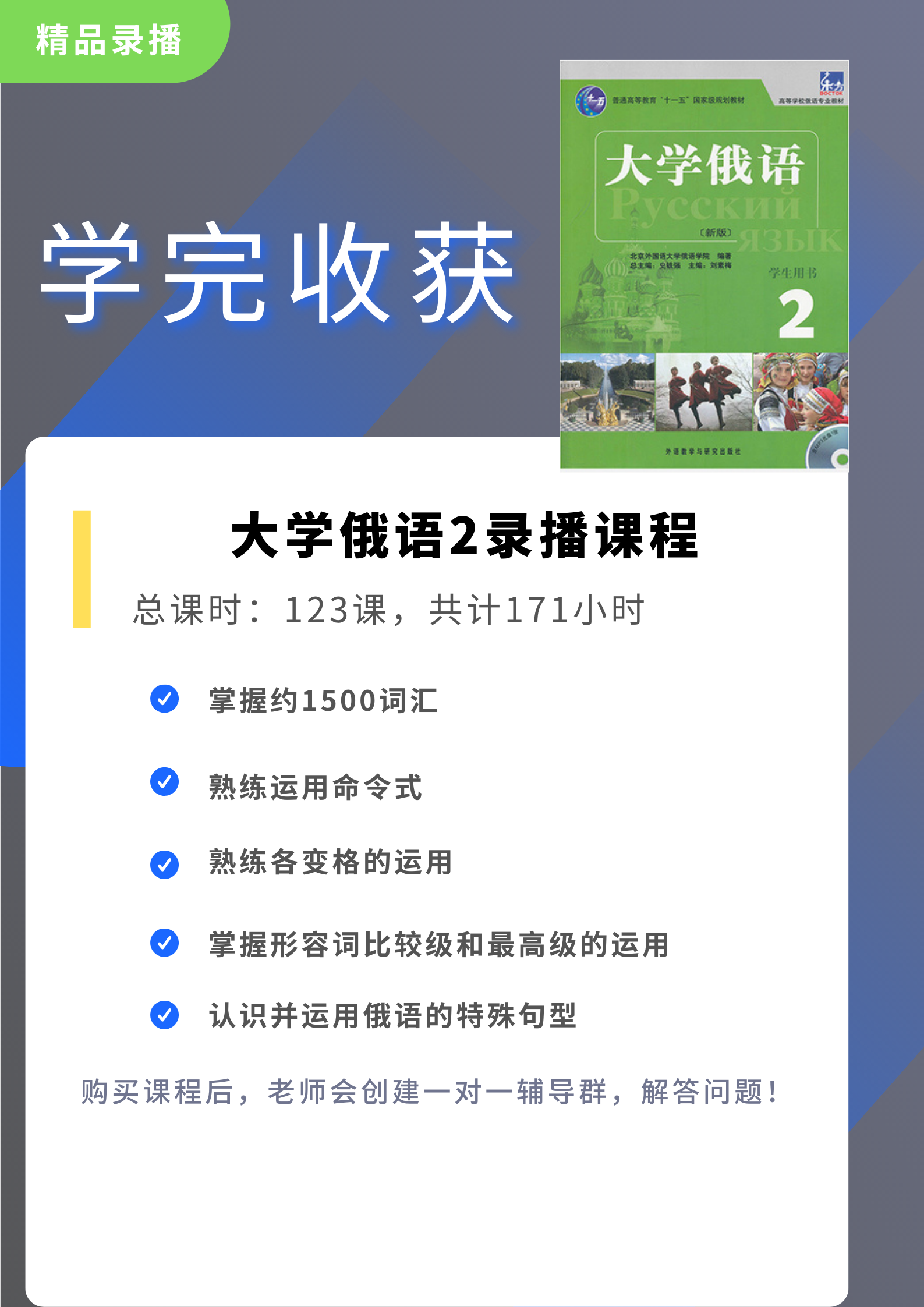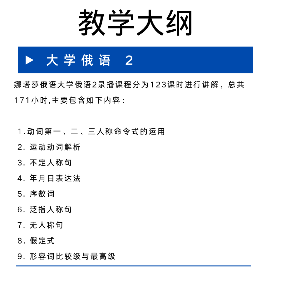 本册语法项目是在第一册的基础上按照词法与句法内容交叉安排的。从语法基本概念开始,逐课简要介绍词类基本知识和各类句子结构模式。词法部分有动词体的对应形式和基本意义、形容词和副动词的级、运动动词、动词命令式和假定式、数词和指示代词及限定代词的变格和用法。考虑到第一册学习名词各格时已经接触到部分前置词的用法,本册将前置词按功能类型归类,以便使学生了解从意义到形式的表达特点。句法部分有句子的成分,简单句的类型以及说明从句,定语从句,时间从句等项目的基础知识。本册语法是以词的构形、常用基本句子模式为主,要求学生在运用各类句子模式的过程中逐步掌握和完善词的构形技巧。