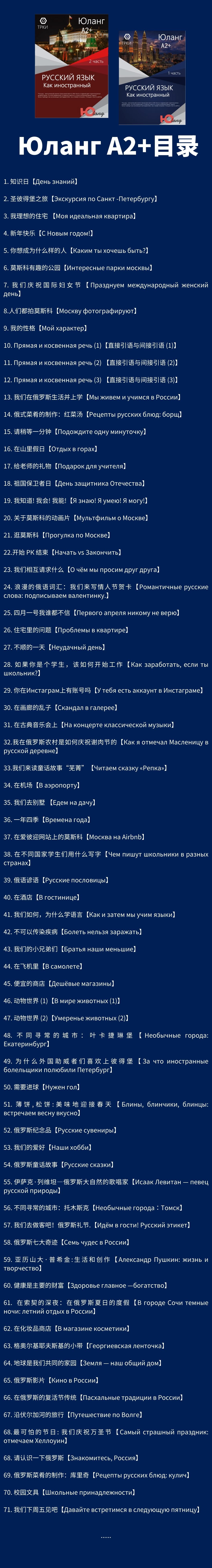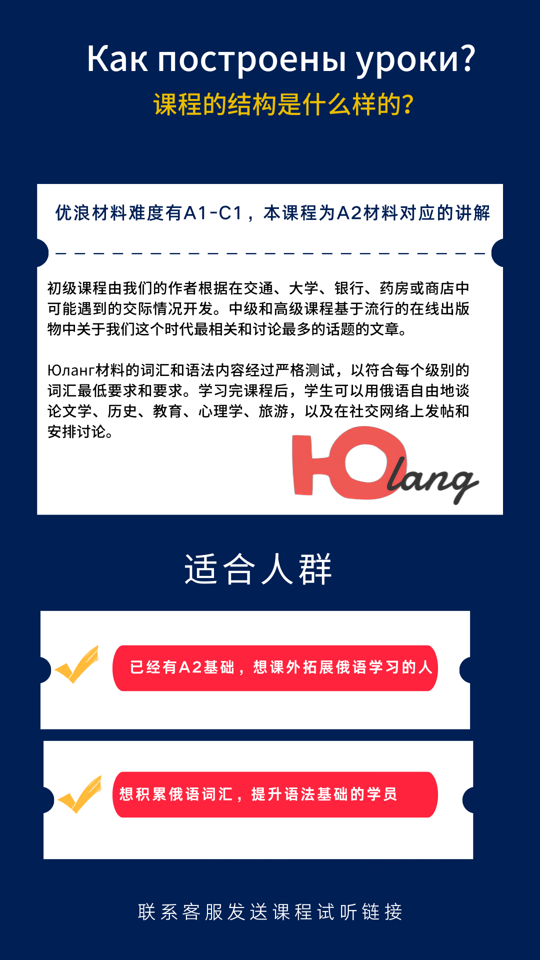 优浪是由俄罗斯一线教师编写的针对对外俄语教学的材料(A1-C2),在俄罗斯的教学圈非常流行。本课程对应的难度是A1+,因此对于学习者要求有一定的俄语基础。学完任何基础入门俄语教材,再学习本课程,可以达到词汇提升,巩固俄语语法的目的!