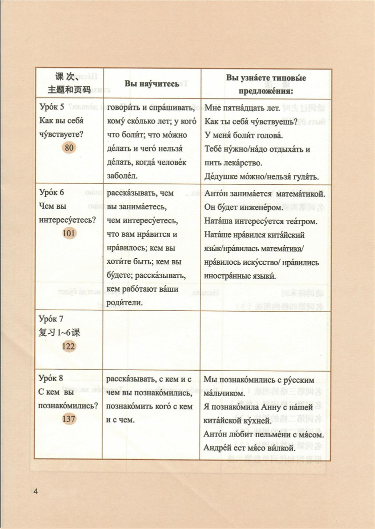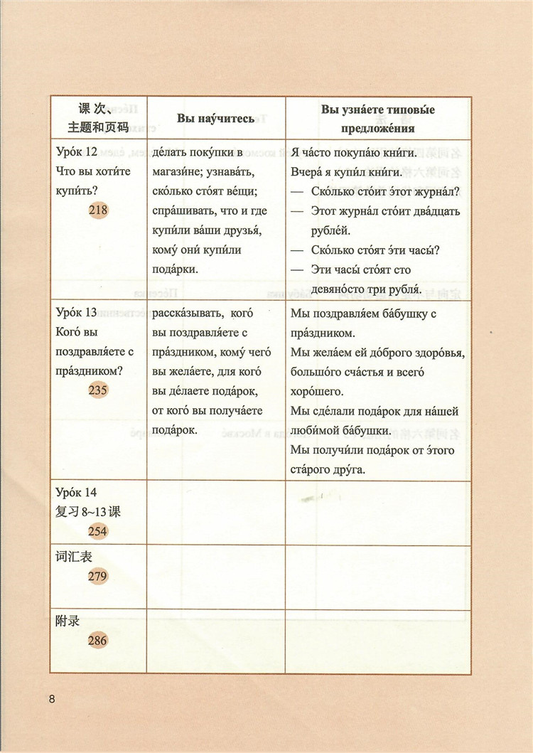 俄语八年级全一册全书分为14课,分为主题活动课和复习课,以下为俄语八年级全一册的目录