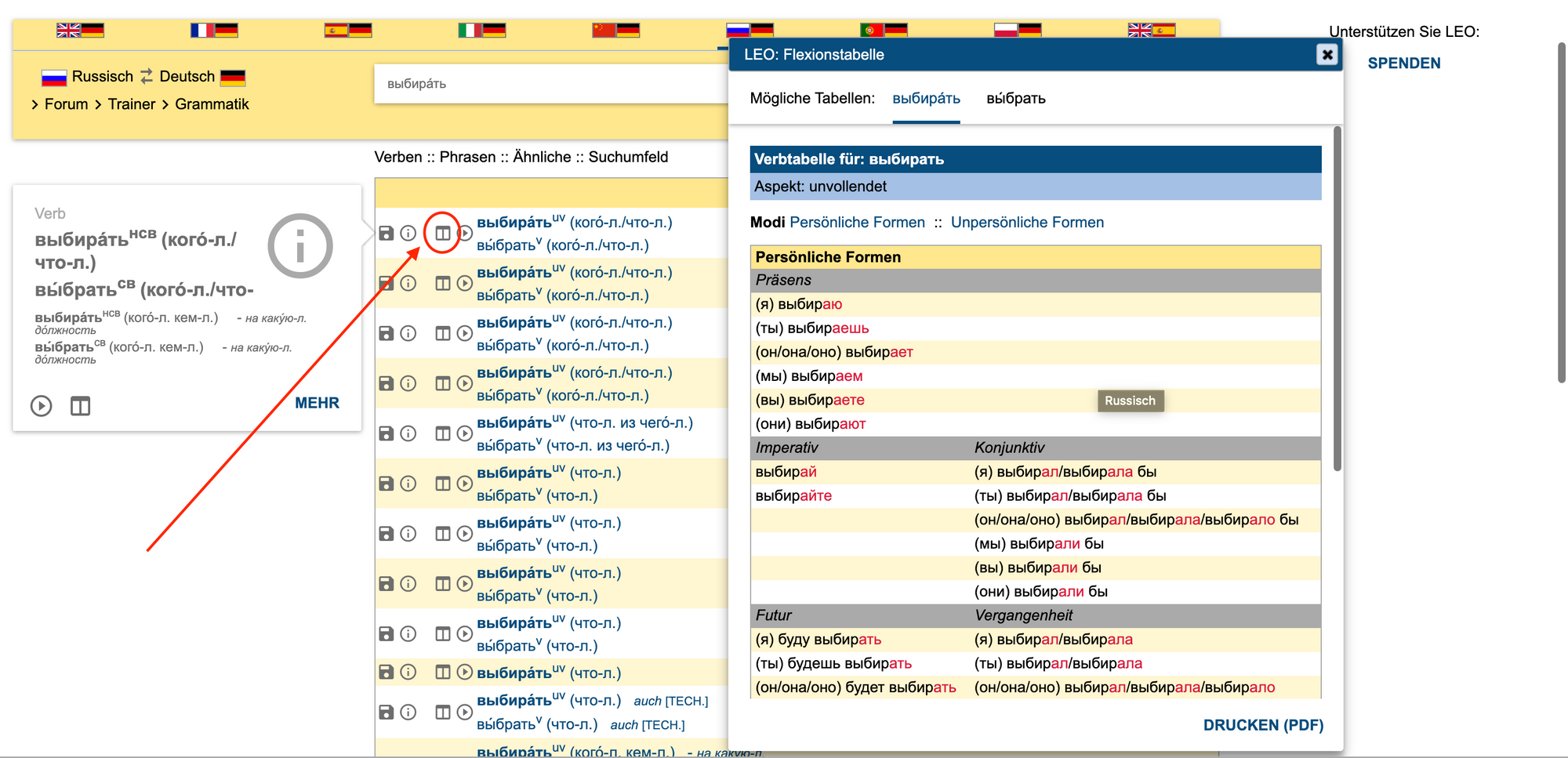 原为德语词典的 Leo,主要功能为翻译德语到包括俄文等九种语言,在搜寻俄语单字时点开搜寻结果单字左侧的小表格图示就可以看到该单字的词尾变化