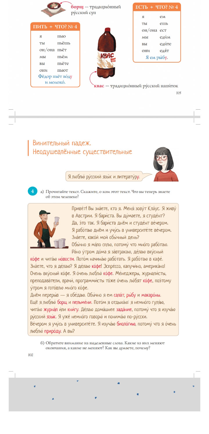 克劳斯(Клаус )是来自德国的学生。她在大学里学习生物学,在咖啡馆里当咖啡师。克劳斯将与来自俄罗斯的俄罗斯姑娘见面,他将拜访该姑娘,他们将一起在全国旅行。他们将参观俄罗斯感兴趣的地方。他将领导该教科书的语言和文化路线,探讨俄罗斯不同地方,动植物,自然资源的地理特征。